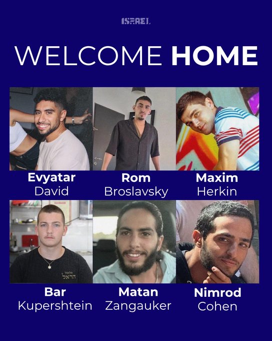 The freed hostages have been identified as Eitan Mor, Alon Ohel, Ziv Berman, Gali Berman, Guy Gilboa-Dalal, Omri Miran, Matan Angrest, Elkana Bohbot, Avinatan Or, Yosef-Haim Ohana, Evyatar David, Rom Braslavski, Segev Kalfon, Nimrod Cohen, Maxim Herkin, Eitan Horn, Matan Zangauker, Bar Kupershtein, David Cunio, Ariel Cunio.