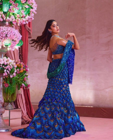 For the high-profile sangeet of Anant Ambani and Radhika Merchant, Janhvi dazzled in a custom Manish Malhotralehenga inspired by the peacocks of Jamnagar. Her ethnic wear celebrates Indian craftsmanship while maintaining a youthful, modern silhouette.