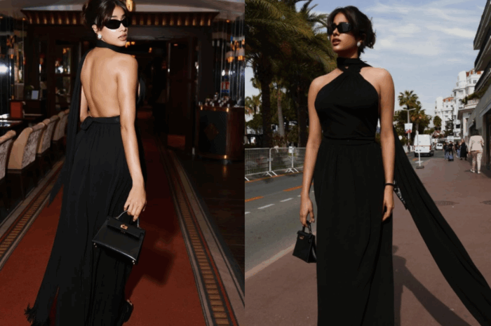 Proving she has an eye for vintage luxury, Janhvi stunned in an archival Yves Saint Laurent gown from the 1975 Rive Gauche collection during her Cannes debut. The black halter dress, featuring a dramatic trailing scarf, was paired with contemporary Miu Miu racer sunglasses- a perfect example of her retro-meets-modern style manifesto.
