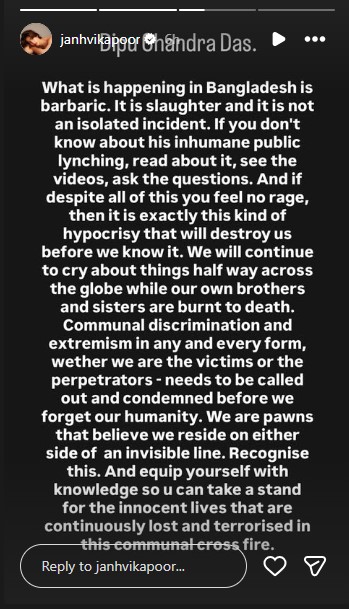Bollywood actress Janhvi Kapoor has reacted strongly to the “barbaric” killing of a Hindu man in Bangladesh. The actress spoke out on the brutal killing of 27-year-old Dipu Chandra Das in Bangladesh’s Mymensingh district, and said it was “not an isolated incident.”