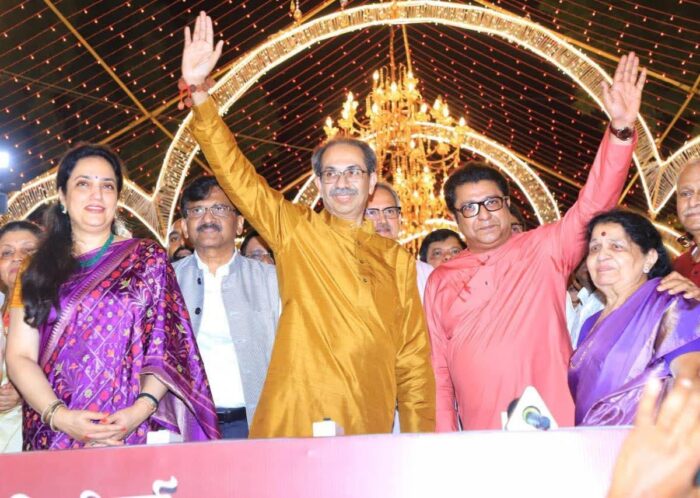 The ‘Deepotsav’ event was symbolic and important optic-wise as both Uddhav and Raj Thackeray arrived in the same car in full media glare. In another car arrived Aaditya Thackeray, son of Uddhav, with Amit, son of Raj, seated next to him. Uddhav Thackeray’s younger son Tejas and Raj’s younger daughter Urvashi were in the rear seat of the car, which was being driven by Aaditya.