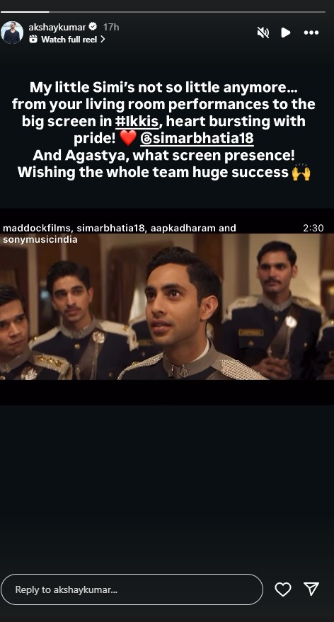 Superstar Akshay Kumar penned a heartfelt message for his niece, Simar Bhatia, as she made her acting debut in ‘Ikkis’, directed by Sriram Raghavan. Taking to Instagram, Akshay expressed pride in Simar’s big-screen debut, sharing the film’s trailer on his story.