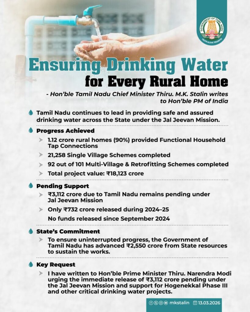 Tamil Nadu Chief Minister M K Stalin has sought Prime Minister Narendra Modi’s intervention to release Rs 3,112 crore in pending dues to ensure completion of the ongoing Jal Jeevan Mission schemes in the state.